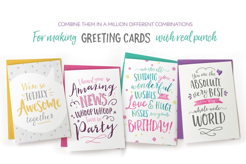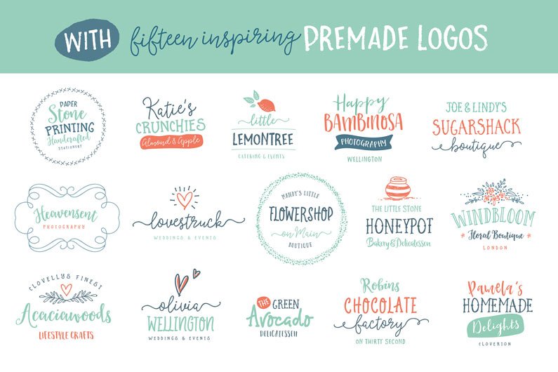 Introducing The Carefully Curated Hand-Lettered Fontbox– with bonuses! ! A fontastic set of carefully-paired, handcrafted fonts, designed to work together in harmony to create awesome hand-lettered typographic designs. As a supersweet bonus you get Twelve Free Premade Logo Templates AND 180 freshly added Illustrations to help you create designs similar to those shown below.